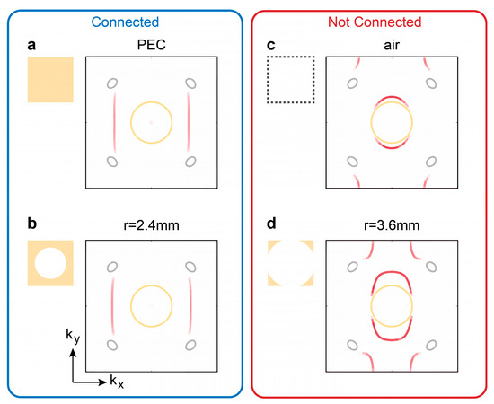 Drilled metallic plates behave like the perfect electric conductor (PEC) boundary. (a,b), When the radius , the drilled metallic plates behave like PEC boundaries. (c,d), When the radius , the drilled metallic plates behave like open boundaries (i.e., air). The frequency here () is lower than the Weyl frequency (), so the Weyl point exhibits a larger projected cross-section. When the metallic structures between unit cells are not connected , there exist trivial surface states akin to the light cone.