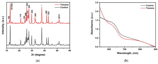 Cesium bismuth iodide perovskite was fabricated using a mixture of DMF and DMSO (9/1) (v/v) with and without toluene treatment. DMF was selected due to its strong dissolution power, while DMSO was chosen due to its strong coordination ability [45]. The molar ratio of CsI/BiI3 was adjusted from 1.5:1 for Cs3Bi2I9 to 1.15 since adjustments in the precursor molar ratio cause significant improvements in the optoelectronic properties. X-ray diffraction (XRD) measurements were carried out on the fabricated CBI perovskite at diffraction angles ranging from 10° to 60° to evaluate the influence of toluene on the crystallinities of the perovskite films. The XRD patterns of both the control and toluene-treated samples exhibited comparable diffraction peak positions, as shown in Figure 2, implying that the addition of toluene does not lead to structural changes. The highest peaks were found to be at the (101) and (202) planes, with corresponding angles of 12.8 and 25.8, indicating (101) preferred orientation. However, there are diffraction peaks of (113) and (300) planes at 26.97 and 41.56 respectively, in both the control and toluene-treated films. These peaks indicate that BiI3 is present in the crystal lattice. The main characteristic peaks for BiI3 that have been documented in the literature are found in planes (113) and (300) [46,47]. The results validate the existence of hybrid 0D-Cs3Bi2I9 and 2D BiI3 structures. A change in the molar ratio leads to the creation of a mixed-dimensional structure [48]. Moreover, all other diffraction peaks correlate well with the fabricated cesium bismuth iodide perovskite films reported in the literature and there are no peaks that can be assigned to CsI crystals; this signifies the full consumption of cesium iodide [29,44].