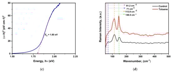 We further performed Raman spectroscopy analysis to confirm the formation of cesium bismuth iodide perovskite film and study the exciton–phonon interactions. Raman spectroscopy has been identified as an efficient experimental method to analyze the exciton–phonon interactions [49]. Both the control film and the toluene-treated film exhibited characteristic peaks at 146.5 and 113.9 cm−1. The wavenumber at 146.5 cm−1 corresponds to the terminal Bi-I symmetric stretch, while the characteristic peak at 113.9 cm−1 is not assigned to any stretching or vibrational mode with regard to cesium bismuth iodide but is the strongest characteristic peak for BiI3 crystal which corresponds to the intense zone center C(G) phonon mode of Ag’ symmetry [49,50,51,52]. The findings imply that both the control and toluene-treated films contain a mixture of two phases, 0D-Cs3Bi2I9 and 2D-BiI3. Other minor characteristic peaks were also observed at 71 cm−1 which originated from BiI3 crystal in the control film, which shifted to 61 cm−1 upon toluene addition The wavenumber at 61 cm−1 is the characteristic peak coming from Cs3Bi2I9 crystal. Moreover, the toluene-treated sample was found to have stronger peak intensity compared to the pristine one, as shown in Figure 2d.