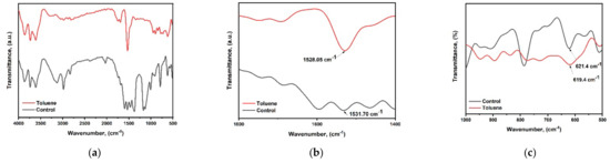 FTIR analysis (a–c) for control film and toluene-treated film.