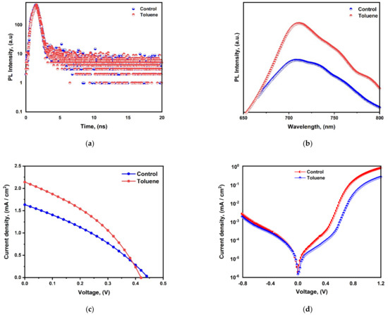 (a) Time-resolved PL intensity; (b) PL intensity; (c) J-V characteristics; (d) J-V Characteristics under dark current measurements.