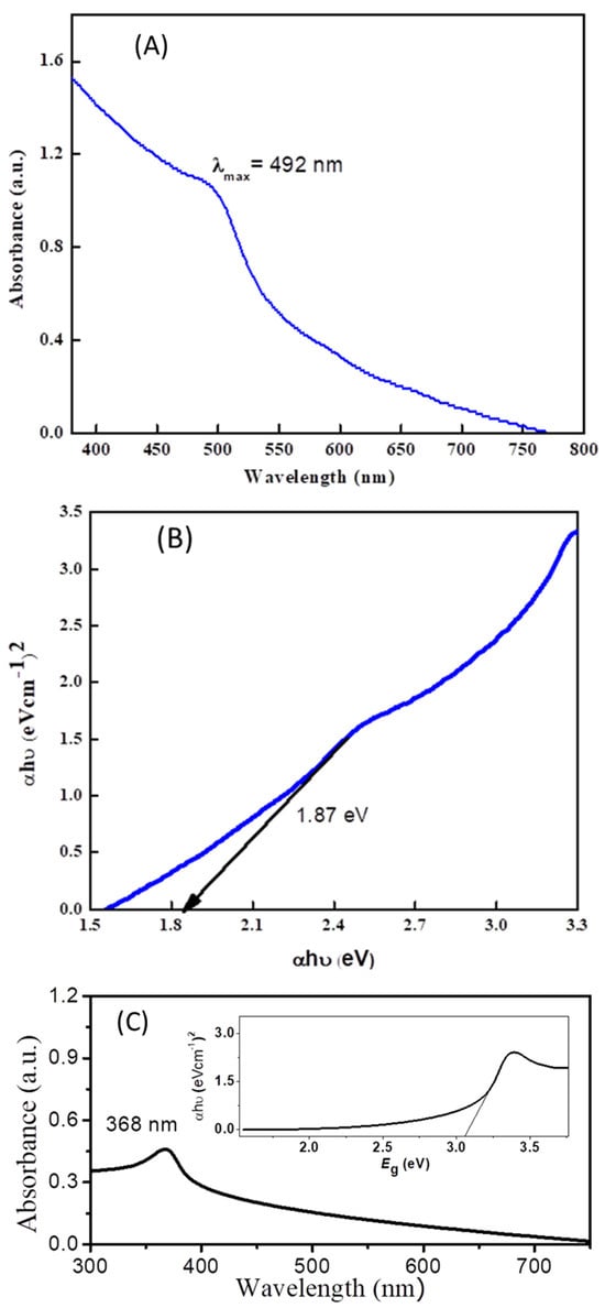 (A) UV-VIS spectrum of cadmium sulfide nanoparticles. (B) Tauc plot showing band gap of cadmium sulfide nanoparticles. (C) UV-VIS spectrum of ZnO with inset Tauc plot for the estimation of the band gap of ZnO.