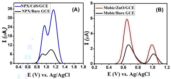 SWVs of 50 µM (A) naproxen obtained from bare and CdS-modified electrodes in PBS solution of pH 7 and (B) mobic from bare and zinc oxide-modified electrodes in BRB solution of pH 4.