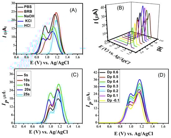 SWVs obtained at a scan rate of 100 mVs−1 on cadmium sulfide-modified glassy carbon electrode, showing the effect of (A) supporting electrolytes on the signals of naproxen; (B) pH of the PBS solutions, in the pH range 2–10, on the signals of naproxen; (C) deposition time on the peak current response of naproxen in a PBS solution of pH 7; and (D) deposition potential on the peak current of naproxen in a PBS solution of pH 7.