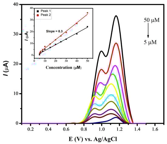 To assess the limit of detection (LOD) for naproxen utilizing a CdS-modified glassy carbon electrode, square-wave voltammetry was employed in a pH 7 phosphate-buffered solution. The process involved applying an accumulation potential of 0.3 V for 15 s, as illustrated in Figure 7. The peak current was found to linearly increase with the increase in the concentration of naproxen, ranging from 5 µM to 50 µM. The voltammograms of the blanks (supporting electrolyte solutions containing no naproxen) were recorded for reference. These measurements were instrumental in determining the standard deviation, allowing for a more precise evaluation of the LOD for naproxen under specific experimental conditions. The following equation was applied for the determination of the limit of detection, using the data obtained from the designed sensor: