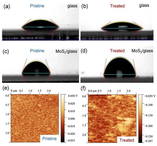 We carried out WCA measurements and EFM imaging to characterize the surface of few-layer MoS2 before and after the UV-O3 treatment. Before the UV-O3 treatment, we observed that the WCAs are very different between a blank substrate (Borofloat® glass, 29° ± 2°) and a glass substrate covered with MoS2 flakes (78° ± 15°), as shown in Figure 1a,c, indicating that the blank glass substrate is much more hydrophilic than the MoS2 surface, which is consistent with the literature [36]. The large uncertainty in the WCA values originated from the variation in flake density over a large area of the sample. After a 4 min UV-O3 treatment, the WCA increased by 15% for the MoS2 sample (becoming slightly more hydrophobic) but decreased by 14% for the blank reference sample (slightly more hydrophilic); see Figure 1b,d. UV-O3 treatment is known to make glass surfaces more hydrophilic by introducing hydroxyl (OH) groups that attract water molecules. The mild increase in hydrophobicity on the MoS2 surface can be attributed to the oxidation of the surface [37,38].