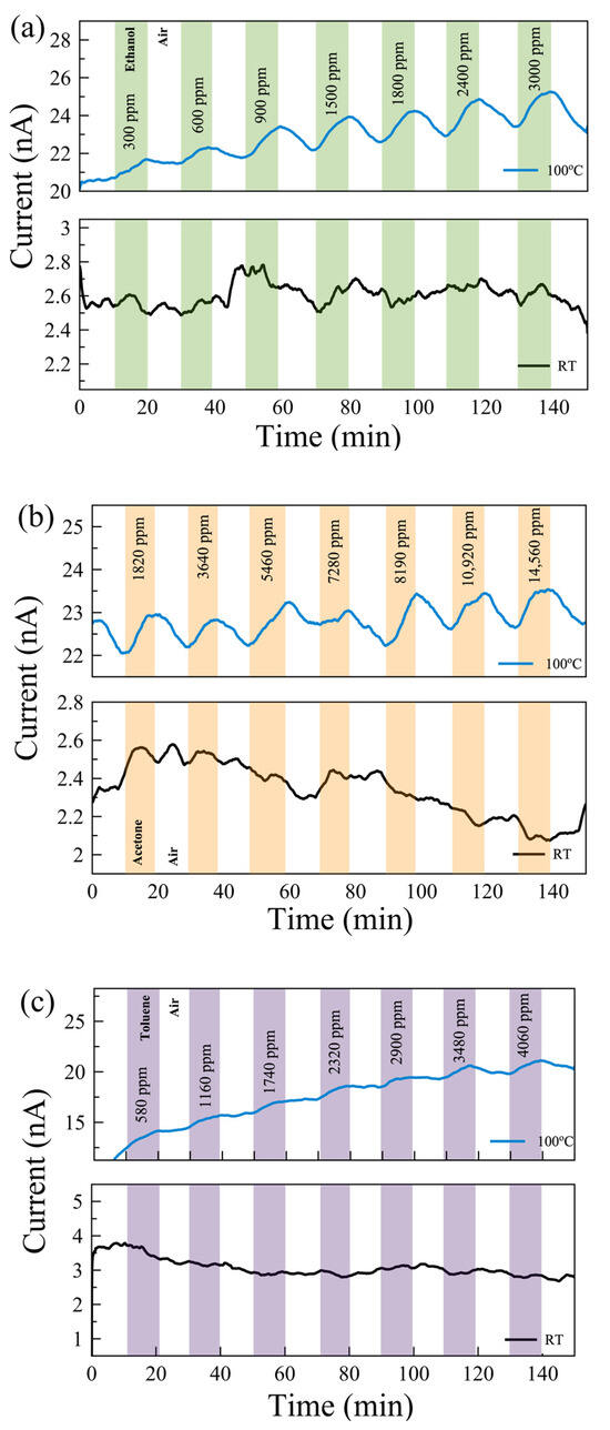 The responses of UV-O3-treated few-layer MoS2 gas sensors exposed to (a) ethanol, (b) acetone, and (c) toluene gases at 100 °C (top) and at RT (bottom). The background drifts in the current values are due to the carriers stabilizing in the sensor.