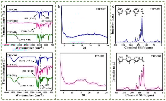 FT-IR spectra of (a) TBP-COF and TTP-COF; (b) XRD patterns of TBP-COF and TTP-COF; (c) 13C NMR spectra and corresponding structures of TBP-COF and TTP-COF.
