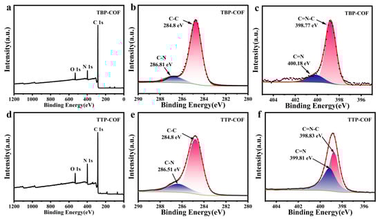Characteristic peaks of the C, N, and O elements were observed in the elemental composition spectra of TBP-COF (Figure 2a) and TTP-COF (Figure 2d), as determined by XPS. The presence of oxygen and water adsorbed on TBP-COF and TTP-COF could explain the observation of oxygen. The valence states of TBP-COF (Figure 2b,c) and TTP-COF (Figure 2e,f) were analyzed using XPS [32]. This confirmed the successful formation of the desired chemical structures in both COFs.