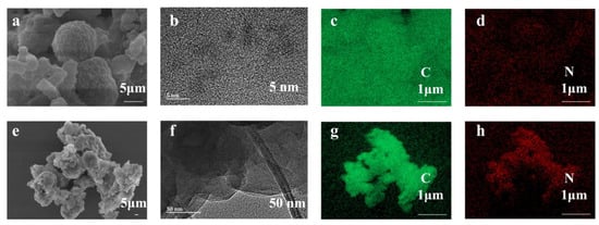 TBP-COF: (a) SEM; (b) TEM; (c,d) EDS. TTP-COF: (e) SEM; (f) TEM; (g,h) EDS.