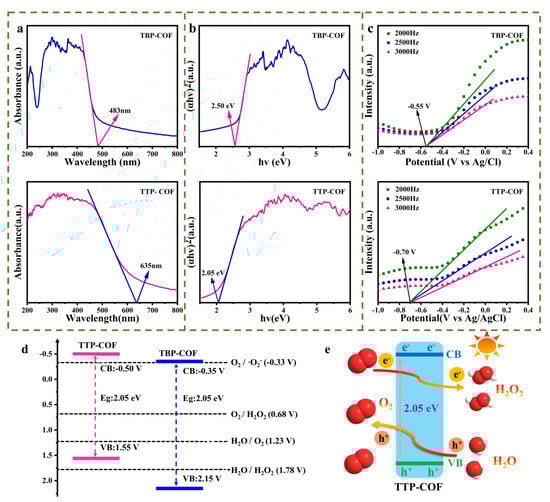 As illustrated in Figure 4a, the UV–visible diffuse reflection spectra (UV-vis DRS) of both COFs revealed strong adsorption in the visible spectrum. The band gaps of TTP-COF and TBP-COF were both calculated using Tauc plots and found to be 2.05 eV and 2.50 eV, respectively (Figure 4b). TTP-COF exhibits a lower band gap and a broader range of visible light absorption due to the presence of a pyridine ring, in contrast to TBP-COF. This characteristic is advantageous for the photocatalytic production of H2O2. The electrochemical Mott–Schottky plots of both COFs (Figure 4c) displayed positive slopes, suggesting that they possess the characteristics of n-type semiconductors [34]. TBP-COF showed a flat band potential of −0.35 V (vs. Ag/AgCl), while TTP-COF had a flat band potential of −0.50 V (vs. Ag/AgCl). The valence band (VB) and conduction band (CB) were determined using the band gap and flat band calculations (Figure 4d). The results confirm that COFs have the ability to facilitate the 2e-ORR pathway, thereby ensuring a significant increase in H2O2 production (Figure 4e).