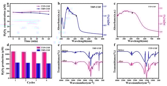 (a) The decomposition of H2O2 by COFs; AQY of (b) TBP-COF and (c) TTP-COF; (d) recycling H2O2 production on TBP-COF and TTP-COF; FT-IR spectra of (e) TBP-COF and (f) TTP-COF obtained before and after photocatalytic recycles.