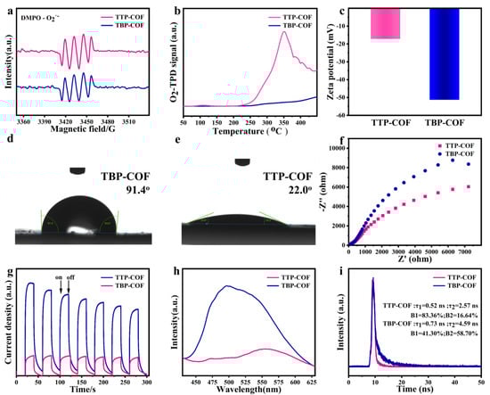 (a) EPR spectra of TBP-COF and TTP-COF; (b) O2-TPD curves of TBP-COF and TTP-COF; (c) the Zeta potential of TBP-COF and TTP-COF; water contact angle patterns of (d) TBP-COF and (e) TTP-COF; (f) EIS curves of TBP-COF and TTP-COF; (g) photocurrent responses of TBP-COF and TTP-COF; (h) PL spectra of TBP-COF and TTP-COF; (i) TRPL spectra of TBP-COF and TTP-COF.