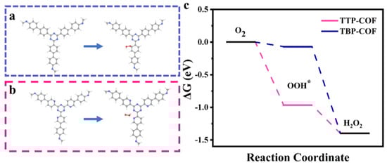 Quantum chemical modeling was conducted using the density functional theory (DFT) method to investigate the adsorption performance of the catalyst and the effect of the composition and structure of the material on the kinetics of the catalytic process [50]. Theoretical calculations provided additional insight into the role of the pyridine ring in facilitating the photocatalytic 2e− two-step ORR performance of COFs in the production of H2O2. The benefits of these catalysts in photocatalytic H2O2 production are determined by the interaction between OOH* intermediates and the active sites on the catalyst surface (Figure 8a,b). Figure 8c demonstrates that the energy barrier of the OOH* intermediate in TTP-COF was lowered by 0.898 eV compared to TBP-COF. This indicates that modifying the pyridine ring of the COFs can enhance the binding strength of OOH* intermediates to the active sites [51], leading to highly effective photocatalytic activity for the production of H2O2.