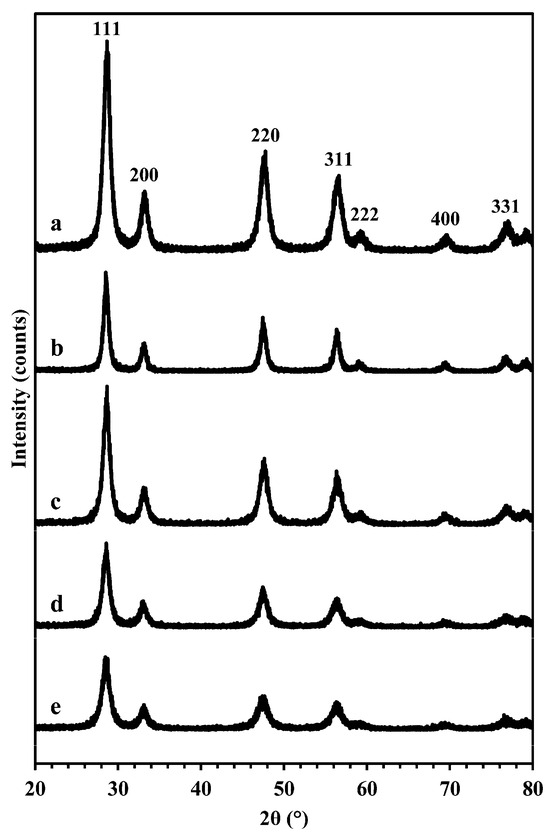 Powder XRD patterns of (a) Ceria-X reference material, (b) Ceria-S, (c) Ceria-K, (d) CGO-S and (e) CGO-K.