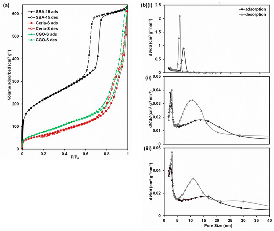 (a) Adsorption (ads) and desorption (des) isotherms for the SBA-15 template and the Ceria-S and CGO-S products made using it. To allow for a direct comparison, the values for the products were corrected for density (×2.72). (b) Pore size distributions for (i) the SBA-15 template and the (ii) Ceria-S and (iii) CGO-S products.