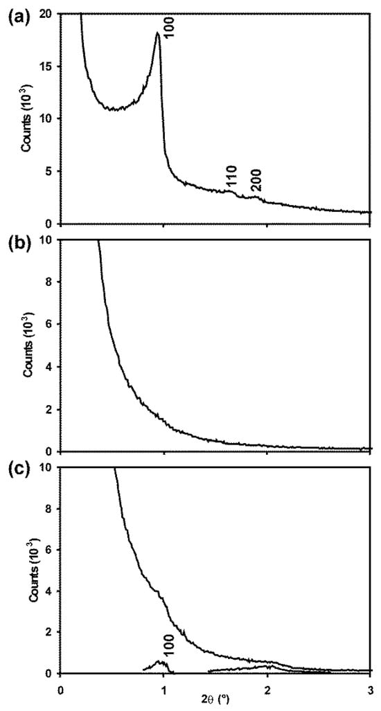 Small-angle X-ray scattering patterns for (a) SBA-15, (b) Ceria-S and (c) CGO-S. Miller indices related to the hexagonal pore structure are indicated.