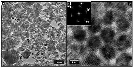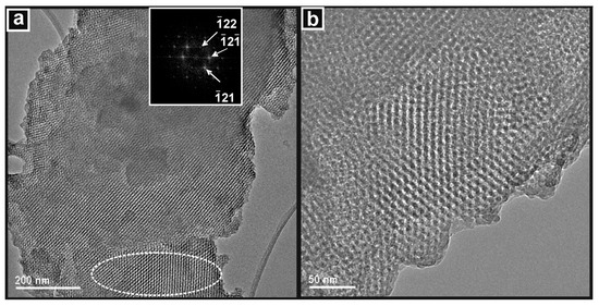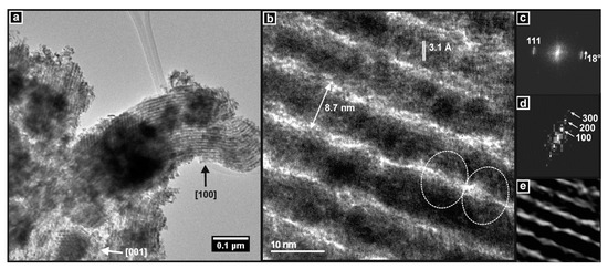 This curved structure is replicated in the image of the SBA-15-templated product, i.e., Ceria-S, in Figure 5a. The large agglomeration (~1 µm) in the image appears to consist largely or entirely of mesoporous particles and there are examples of both the [100] and [001] orientations (it should be kept in mind that some mesoporous particles may not appear so if they are overlapped by other particles or if their pore structure is not aligned with the electron beam of the TEM). The interpore spacing was measured directly from the images and from DDPs and gave values of 8.9–9.7 nm. This is consistent with the same dimension for the SBA-15 template obtained by the TEM and SAXS (see Table 1). The high-resolution image in Figure 5b contains several important features. First, the imaged area of the sample consists of cylindrical nanorod structures of uniform diameter separated by narrow pores. This is the inverse of the SBA-15 structure, where the pores of the template were filled with material and the walls of the template were removed to leave pores of complex shape between the nanorods. Two examples of bridges that interconnect the nanorods, and thus, hold the structure together are circled in the image. Second, the surfaces of the nanorods seemed quite rough. Both the nanorod diameter and the pore width appeared to vary slightly along the length of the nanorods. Third, the area imaged was essentially a single crystal. The crystal lattice planes were visible in the image and are seen to remain parallel across the structure and between nanorods. Therefore, the bridges between nanorods must have played an important role in achieving this long-range alignment of the lattice during crystallisation and grain growth. The DDP in Figure 5c confirmed the single-crystal nature of the imaged sample, as it contains only one pair of spots that are consistent with the 111 planes of the ceria lattice. However, and finally, these spots were, in fact, extended into short arcs—of 18° in this case—which indicates that the lattice planes gradually changed direction across the image while remaining essentially parallel. This strained crystal structure was an interesting and general feature of the mesoporous products prepared in this study.