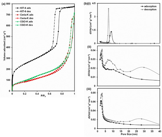 (a) Adsorption (ads) and desorption (des) isotherms for the KIT-6 template and the Ceria-S and CGO-S products made using it. To allow for a direct comparison, the values for the products were corrected for density (×2.72). (b) Pore size distributions for (i) the KIT-6 template and the (ii) Ceria-S and (iii) CGO-S products.