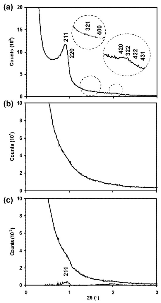 Small-angle X-ray scattering patterns for (a) KIT-6, (b) Ceria-K and (c) CGO-K. Miller indices related to the cubic pore structure are indicated.