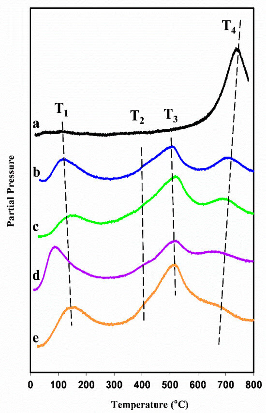 The TPR spectra were obtained in flowing dilute hydrogen by recording the water signal (m/q = 18) as a function of temperature for the Ceria-X reference material and for all four products. The five spectra are presented together in Figure 12. The peaks are grouped and labelled as T1 to T4, in order of increasing temperature. The reference material exhibited a very small peak at around 100 °C (T1), which could be attributed to the desorption of physisorbed water from the ceria surface. The only other feature was a very large peak at 745 °C (T4), which was attributed to the reduction of relatively unreactive sample oxygen species by the hydrogen, which is usually assigned as bulk or lattice oxygen [52]. When comparing this spectrum with those of the four mesoporous products taken together, several important and general differences were seen.