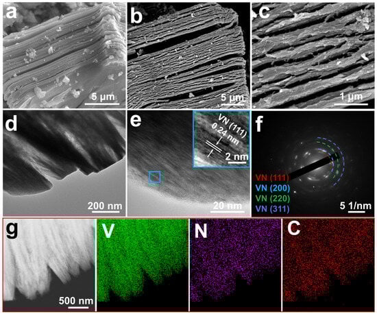 In the FESEM image (Figure 1a), AlF3/VN@NC indicates a significant volume expansion compared to the compact bulk structure of V2AlC itself, and a pronounced lamellar structure is produced. Meanwhile, the presence of bulk AlF3 particles on and around the AlF3/VN@NC layer is observed. The precipitation of AlF3 from the interlayer further enlarges the interlayer spacing. As shown in Figure 1b,c, the AlF3 has been removed from the surface of the VN@NC material after treatment with alkali solution. In this post-treatment process, the lamellar structure of the VN@NC material became more obvious and still well maintained the carbon skeleton derived from MAX with the carbon layer thickness ranging from 0.15–0.25 μm. The carbon skeleton increases the ionic conductivity of VN@NC, and the greater specific surface area provides abundant catalytically active spots, benefiting the sorption and catalytic transformation of LiPSs. The TEM image (Figure 1d) shows a clear layered structure of VN@NC, with the thickness of the layers corresponding to Figure 1c. Meanwhile, the HRTEM image (Figure 1e) exhibits the growth of VN mainly along the V layer in V2AlC, this may be due to the template effect of the MAX, with an inter-lattice stripe distance of 0.24 nm in the inset, which corresponds to the crystalline surface of VN (111). Diffraction rings in selected area electron diffraction (SAED) images (Figure 1f) are associated with the (111), (200), (220), and (311) crystalline facets of the VN, which indicates that VN@NC has a polycrystalline structure. In addition, the element mapping for VN@NC (Figure 1g) demonstrates that V, N, and C are uniformly dispersed in the VN@NC material, which demonstrates that the VN nanoparticles are distributed uniformly in the NC skeleton derived from MAX.