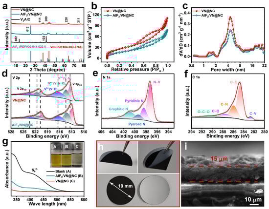 (a) XRD patterns for VN@NC, AlF3/VN@NC, and V2AlC; (b,c) N2 sorption/desorption isotherms and pore size distribution for VN@NC and AlF3/VN@NC. High-resolution (d) V 2p XPS spectra of VN@NC and AlF3/VN@NC; (e) N 1s, and (f) C 1s XPS spectra of VN@NC; (g) digital photo and UV–vis absorption spectra of the Li2S6 solutions before and after adding AlF3/VN@NC and VN@NC; (h) digital photos of the VN@NC/PP; (i) SEM image of the cross-section of the as-prepared VN@NC/PP.