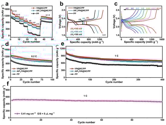 The rate and cycling performances of LSBs assembled with VN@NC/PP, AlF3/VN@NC/PP, or PP are tested under different current densities. As presented in Figure 4a, the capacities of VN@NC/PP are 1372, 1155, 1010, 823, 783, 660, and 560 mAh g−1 at 0.1, 0.2, 0.5, 1, 2, 3, and 4 C, respectively. In contrast, the rate capacities of AlF3/VN@NC/PP or PP are lower. The higher structural and chemical stability and better sulfur utilization of VN@NC/PP are illustrated [71]. The constant current discharge–charge curves of VN@NC/PP, AlF3/VN@NC/PP, and PP at 0.1 C for the third cycle are selected (Figure 4b). The corresponding overpotential in the charge–discharge curve is noted as ΔE. ΔE1 = 140 mV for VN@NC/PP is lower compared to AlF3/VN@NC/PP (ΔE2 = 160 mV) and PP (ΔE3 = 190 mV). As shown in Figure 4c, for LSBs with VN@NC/PP, the discharge–charge curves are selected for the third cycle under 0.1 to 4 C. As the current density increases, the voltage polarization phenomenon is more obvious, but the discharge platform remains comparatively stable, and a platform for the transformation from long-chain LiPSs to Li2S2/Li2S can still be seen at high current densities of 4 C. The above results demonstrate that the special physicochemical properties of VN@NC play an important role in improving the oxidation–reduction kinetics, reducing polarization, and improving the rate performance of the cathode [31,62]. Figure 4d illustrates the cycle performances of VN@NC/PP, AlF3/VN@NC/PP, and PP at 0.2 C. The incipient capacity of VN@NC/PP is 1271 mAh g−1 and remained at 960 mAh g−1 over 100 rounds. The averaged capacity degradation ratio of 0.24% per round is lower compared to AlF3/VN@NC/PP (0.27%) and PP (0.34%). Meanwhile, at 0.5 C, the incipient discharge capacity of the LSBs with VN@NC/PP is 1189.8 mAh g−1 and remains at 754 mAh g−1 over 300 rounds, while the incipient capacities of AlF3/VN@NC/PP and PP are 1089 mAh g−1 and 870.4 mAh g−1, respectively, and decayed to 697.8 mAh g−1 and 582.6 mAh g−1 over 300 rounds, respectively (Figure S4). As shown in Figure 4e, at 1 C, the incipient capacity of VN@NC/PP is 1052.4 mAh g−1 and remains 693.8 mAh g−1 over 400 rounds with an average degradation rate of 0.085% per rounds, shows superior cycling stability to AlF3/VN@NC/PP (646 mAh g−1, 0.094%) and PP (483 mAh g−1, 0.095%).