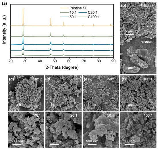 (a) XRD patterns of pristine Si and P-milling samples. SEM and HRSEM images of (b) pristine Si and P-milling particles with a mass ratio of (c) 10:1, (d) 20:1, (e) 50:1, and (f) 100:1.
