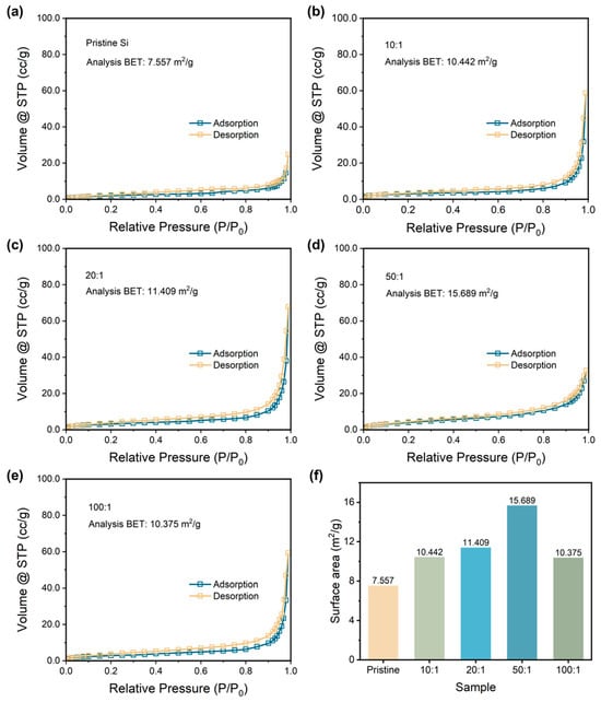Nitrogen adsorption and desorption curves with analysis of the BET results of (a) pristine Si and p-milling samples with a mass ratio of (b) 10:1, (c) 20:1, (d) 50:1, and (e) 100:1. (f) Surface area for the pristine Si and P-milling samples.
