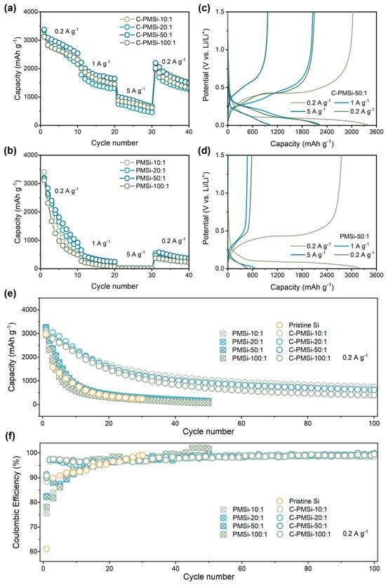 Rate capability of (a) C-PMSi and (b) PMSi anodes with the corresponding charge–discharge curves of (c) C-PMSi and (d) PMSi anodes. (e) Cyclic property and (f) Coulombic efficiency of PMSi, C-PMSi, and pristine anodes under 0.2 A g−1.