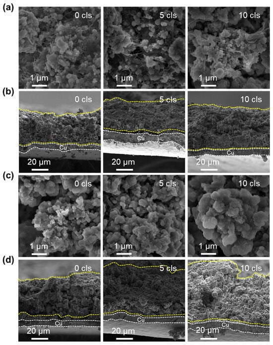 SEM images of the (a,c) surface and (b,d) cross-sections of C-PMSi-50:1 and PMSi-50:1 anodes before and after 5 and 10 cycles.