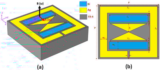 Figure 1 illustrates the schematic diagram of the unit cell within the proposed metamaterial, providing an overview of the design of the electromagnetic coupling metasurface. This metasurface comprises a pair of Bi bars and an Ag bowtie enclosed by an outer rectangular Ag ring, which serves as an SRR with cut-wire patterns deposited on an FR-4 substrate. We chose Ag as the plasmonic material because of its low metal loss and cost-effectiveness. It is worth mentioning that other noble metals (e.g., Au, Al, or Cu) can replace the plasmonic material, and the choice of the dielectric material, Bi, is solely driven by its exceptional conductivity and mobility, which significantly amplifies the metasurface’s nonlinear response. Furthermore, FR-4 was chosen due to its compatibility with the chip substrate.