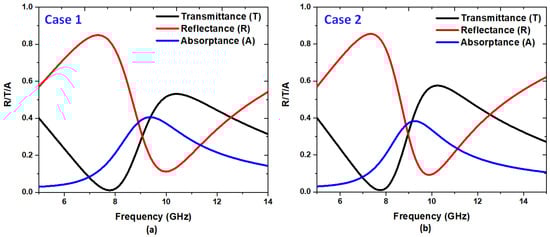 Transmittance, reflectance, and absorptance for (a) the case without the Ag bowtie surface (Case 1) and (b) the case with the Ag bowtie surface (Case 2).