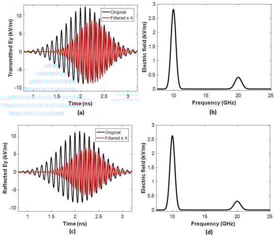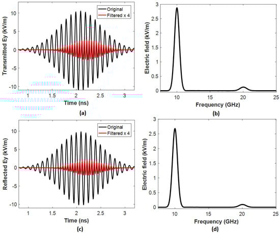 Figure 4 and Figure 5 compare the transmitted and reflected electric fields at 10 GHz for Case 1 (Figure 4a–d) and Case 2 (Figure 5a–d), respectively. Compared to the incident fundamental wave, the double frequency in Figure 4 and Figure 5 demonstrates that the proposed metasurface successfully generates the SH wave at 20 GHz.