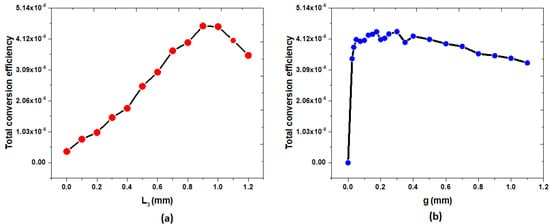 Relationship between (a) L3 and (b) g values and total conversion efficiency, .