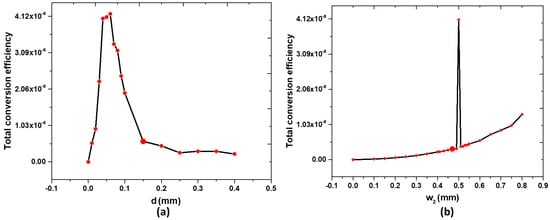 Relationship between (a) the values of d and (b) w2 and the total conversion efficiency, .
