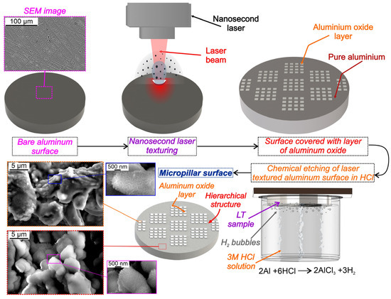 Two distinct sets of aluminum micropillar surfaces were prepared through chemical etching in hydrochloric acid (HCl) and laser texturing. The first set of surfaces only underwent laser texturing before etching in HCl, while the second set of surfaces received a second laser treatment after the HCl etching.