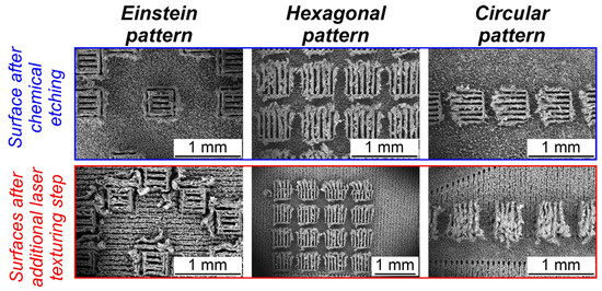 SEM images: micropillar sample after chemical etching (top) and micropillar samples after additional laser texturing step (bottom).