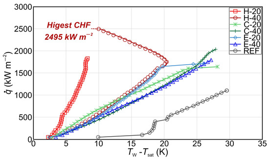 Pool boiling experiments on fabricated aluminum micropillar surfaces were conducted at atmospheric pressure using double distilled water. Boiling curves, recorded up to CHF incipience, are shown in Figure 5 for all tested samples. As a benchmark for enhancement comparison, the bare aluminum surface was denoted as reference (REF). In Figure 5, the boiling curves recorded during the first experimental run are presented. For surfaces characterized by exceedingly high CHF values, it was not possible to carry out a subsequent boiling run because of the very high temperatures (i.e., above 250 °C) reached at the bottom of the aluminum sample and the consequent destruction of the PEEK flange. The CHF obtained on the reference surface was 1100 kW m−2. The highest CHF of 2495 kW m−2 was recorded on the sample with a hexagonal pattern of higher micropillars, representing an enhancement of 126% over the reference surface. All other tested micropillar samples also exhibited a CHF enhancement over the reference surface within the range of 48% to 93%. Moreover, on sample H-40, the boiling curve “hook back” effect was observed. This can be attributed to the activation of the additional nucleation sites on the top of the laser microstructures in the region of high heat fluxes, as was established by Kruse et al. [58] and observed in other studies as well [59,60].