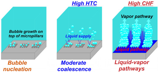 A surface with engineered micro/nanostructures can exhibit an extended active heat transfer area, leading to an increase in the nucleation site density during boiling [26,27]. Additionally, micro/nano wicking structures characterized by superhydrophilicity lead to an intensified capillary force, which results in increased liquid supply and the mitigation of dry spot formation [28,29]. Evidently, both the CHF and the HTC on structured surfaces are significantly influenced by surface wettability. The latter plays a major role in bubble dynamics by governing processes such as nucleation, growth, coalescence, and departure [30]. Increased surface wettability leads to a delayed CHF incipience, which can be attributed to more intense liquid rewetting, while decreased surface wettability results in promoted bubble formation due to a reduced nucleation energy barrier [31,32,33]. The synergy between increased bubble nucleation sites and enhanced liquid replenishment serves to further facilitate boiling heat transfer, a concept that has been advanced by the design of surfaces with locally mixed wettability [15,34,35].