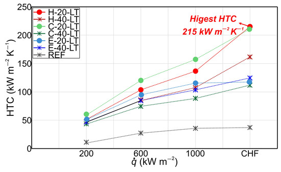 Moreover, Figure 9 presents the HTC values of micropillar surfaces with the additional laser texturing step at various heat flux levels. It is evident that all laser-textured surfaces demonstrated a notable enhancement in HTC compared to the untreated reference surface. Specifically, the highest HTCs were recorded at the critical heat flux or in the region of heat fluxes near the CHF. The surface with the hexagonal pattern and smaller micropillars exhibited the highest HTC, recording a value of 215 kW m−2 at CHF. Notably, surface H-20-LT displayed an HTC enhancement of 481% over the reference bare surface (REF). A possible explanation for the higher HTC values achieved on surfaces with smaller micropillars and additional laser texturing steps compared to surfaces with higher micropillars may be associated with the fact that taller micropillars can potentially extend the flow path of liquid and create greater flow resistance. This may prolong the detachment of the bubble from the surface leading to reduced HTC.