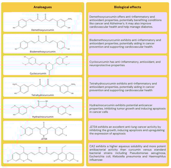 Curcumin is a polyphenolic compound with the IUPAC name (1E, 6E)-1,7-bis(4-hydroxy-3-methoxyphenyl)-1,6-heptadiene-3,5-dione, and has the chemical formula of C21H20O6. Curcumin consists of three structural fragments: a 7-carbon linker that includes an α, β-unsaturated β-diketone moiety, and two aromatic ring systems with o-methoxy phenolic groups [15]. It possesses hydrophobic characteristics, indicated by a log P of nearly 3.2. This polyphenol exhibits low aqueous solubility (30 nM) under both acidic as well as neutral pH values but demonstrates solubility in semipolar solvents such as ethyl alcohol, methyl alcohol, acetone, alkali hydroxides, glacial acetic acid, and polar aprotic solvents like dimethyl sulfoxide [16]. Its melting point is 183 °C, and its molecular weight is 368.37 g/mol. The enolic and two phenolic protons have been identified as the sources of the three empirically reported pKa values of 10.69 (10.51), 9.30 (9.88), and 8.54 (8.38). The first pKa number represents the dissociation of the enol proton, whereas the values in parenthesis represent the dissociation of the two phenolic protons. Curcumin exhibits numerous methoxy substitutions in its diferuloylmethane chemical structure, resulting in a yellow coloration, particularly within the pH range of 2.5 to 7. Beyond this range, the color transforms into a deep red hue as the pH exceeds the specified limit. Formidable challenges associated with curcumin, including limited bioavailability, insufficient distribution within tissues, rapid clearance, chemical degradation, and toxic potential, have resulted in its categorization as a pan-assay interference compound as well as a failed metabolic panacea molecule [15]. Moreover, turmeric has been found to contain over 50 curcuminoids, including but not limited to bisabocurcumin, curcumalongin, cyclocurcumin, and terpecurcumin [1]. Many reported biological and pharmacological activities can be attributed to the chemical derivatives of curcumin, including demethoxycurcumin, bisdemethoxycurcumin, and cyclocurcumin [17]. Hydrazinocurcumin, a newly developed synthetic analog of curcumin, has demonstrated superior delivery capabilities compared to curcumin and has been extensively researched for its pharmacological effectiveness [18]. The structure of curcumin analogues and their biological effects is illustrated in Figure 1.