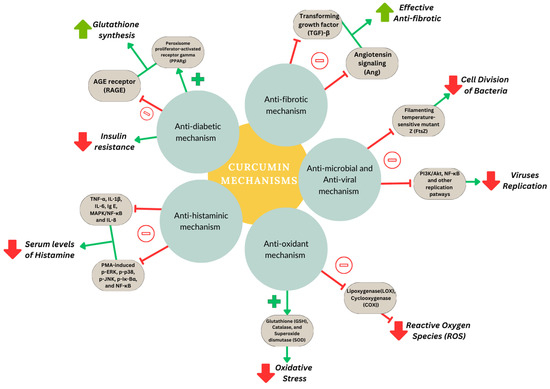 The antidiabetic ability of curcumin is suggested to be due to the production of end products via advanced glycation by the suppressed expression of the respective receptors through the activation of peroxisome proliferator-activated receptor gamma (PPAR-γ) activity, thereby promoting an increase in glutathione (GSH) synthesis. Additionally, the heightened secretion of insulin from pancreatic cells contributes to a reduction in insulin resistance (Figure 3) [4]. Curcumin’s antifibrotic effects are attributed to its ability to hinder the migration, collagen production, and proliferation of fibroblasts by regulating the expression of TGF-β and angiotensin signaling (Figure 3) [32]. The antimicrobial efficacy of curcumin is due to its interaction with FtsZ, a crucial protein responsible for initiating cell division. This interaction disrupts the normal cell division process, thereby inhibiting the growth and proliferation of microbial organisms (Figure 3) [33]. Curcumin demonstrates a remarkable capacity to neutralize free radicals, including oxygen radicals and reactive nitrogen species. Moreover, curcumin can modulate key enzyme activities such as GSH, superoxide dismutase (SOD) and catalase, reinforcing the cellular defense mechanisms against oxidative stress [34]. This compound modulates the metabolism of amyloid beta and exerts inhibitory effects on its aggregation. Additionally, it has an important role in the disaggregation process, i.e., preventing fibrillar amyloid formation, due to its robust anti-amyloidogenic effects [35]. Curcumin’s antiviral properties were demonstrated on viruses of various strains, including feline infectious peritonitis virus, parainfluenza virus type 3, herpes simplex virus, vesicular stomatitis virus, respiratory syncytial virus and flock house virus [36]. Hence, evidence from various sources increasingly suggests that curcumin inhibits viruses and reduces infection through several inhibitory mechanisms. These may mean either directly interfering with the replication of the virus or the suppression of essential viral replication signaling pathways (Figure 3). Investigations revealed that curcumin reduced histamine levels in the serum TNF-α and ovalbumin-specific IgE in allergic rhinitis mice induced with ovalbumin. Along with the suppressive effect on the production of various inflammatory cytokines, this polyphenol considerably inhibited the activation of PMA-induced p-ERK, p-p38, p-JNK, p-Iκ-Bα, and NF-κB. It was disclosed that curcumin modulates mast cell-mediated allergic responses in allergic rhinitis, partly attributed to the suppression of the MAPK/NF-κB pathway [37].