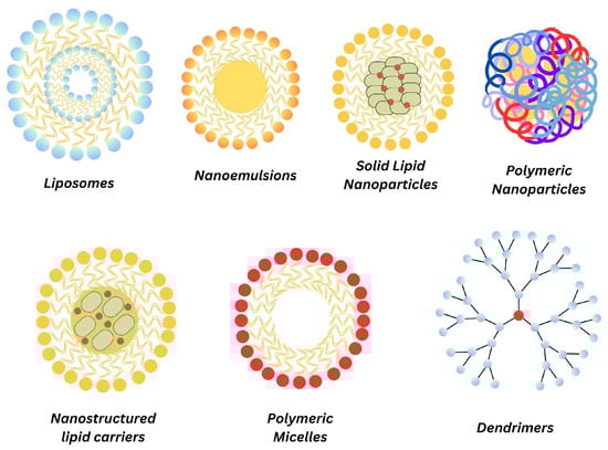 Despite the fact that curcumin has gained widespread attention for its diverse therapeutic properties, its clinical utilization is hindered by poor solubility, low bioavailability, and rapid degradation in the body. The emergence of nanoparticle-based drug delivery systems shows promise in addressing these challenges and improving the effectiveness of curcumin in diverse medical applications. Nanoparticles can encapsulate curcumin, improving its solubility and protecting it from degradation in the gastrointestinal tract, thereby increasing its absorption and, consequently, enhancing bioavailability. The sustained release profile contributed by nanoparticles can prolong the therapeutic effects of curcumin, reducing the need for frequent administration and hence improving patient adherence. The functionalization of nanoparticles with ligands or antibodies allows for the targeted delivery of curcumin which can maximize therapeutic effects while minimizing side effects on healthy tissues [38]. Furthermore, nanoparticles can facilitate the cellular uptake of curcumin, overcoming barriers imposed by cell membranes. Liposomes, NEs, and lipid nanoparticles such as SLNs and NLCs are commonly used to encapsulate curcumin. Moreover, PMs, dendrimers and PNs comprising biocompatible polymers are utilized to formulate nanoparticles for curcumin delivery, providing sustained release and protection (Figure 4).