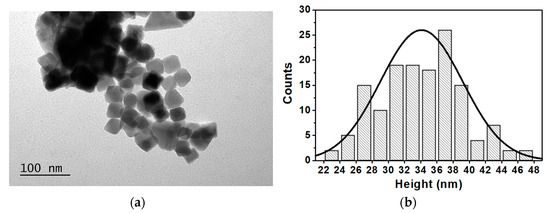 The composition and crystallographic structure of the mixed ferrite nanocubes were investigated by X-ray diffraction (XRD) using a PAN’alytical X’Pert PRO diffractometer (Malvern Panalytical Ltd., Malvern, UK), at the Electron Microscopy Unit of the University of Trás-os-Montes and Alto Douro (UTAD), Vila Real, Portugal. The sample was analysed operating with CuKα radiation (λ = 0.154060 nm), in a Bragg–Brentano configuration. The XRD diffractogram was acquired and interpreted using Profex Software (version 4.3.6) (RMS Foundation, Bettlach, Switzerland) [37], with a BGMN Rietveld model [38].
