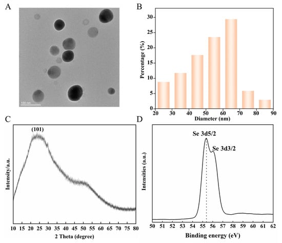 Characterization of synthesized and Se NMs. (A) TEM image; (B) size distribution of Se NMs; (C) XRD pattern; (D) XPS diagram of Se NMs.