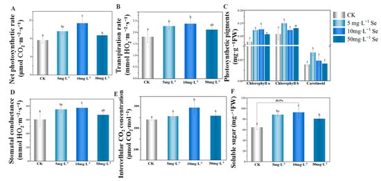 (A) Net photosynthetic rate; (B) transpiration rate; (C) photosynthetic pigments; (D) stomatal conductance; (E) intercellular CO2 concentration; and (F) soluble sugar in FDDB tea buds treated with 5, 10, and 50 mg·L−1 Se NMs. Different letters represent significant differences (Duncan test; p < 0.05).