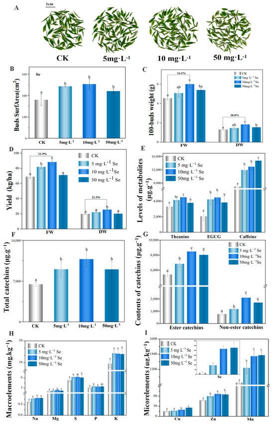 (A) Image of picked young tea bud tips and their production and quality under Se NMs treatments: (B) buds surface area; (C) 100-bud fresh weight (FW) and dry weight (DW); (D) total yield; (E) contents of theanine, EGCG, and caffeine; (F) total catechins content; (G) ester and non-ester catechins content; (H) macroelement levels; and (I) microelement levels. Different letters indicate significant differences according to Duncan’s test, with p < 0.05.