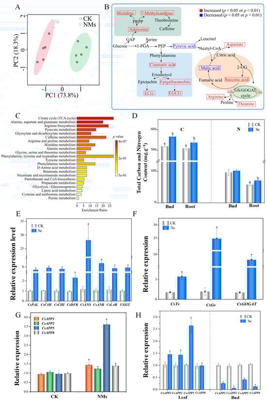 (A) Principal components analysis (PCA) of metabolites in tea buds after application of Se NMs; (B) changes in the metabolites profiles and metabolic pathways in the tea buds of FDDB under Se NMs treatment; (C) enrichment analysis of tea bud metabolic pathways under Se NMs; (D) total carbon (C) and nitrogen (N) content in tea buds and roots; (E) relative expression of catechins in tea leaves and (F) theanine synthesis genes in tea leaves; (G) relative expression of theanine transport in tea roots and (H) in tea leaves and buds. Different letters represent significant differences, and asterisks indicate * p < 0.05.